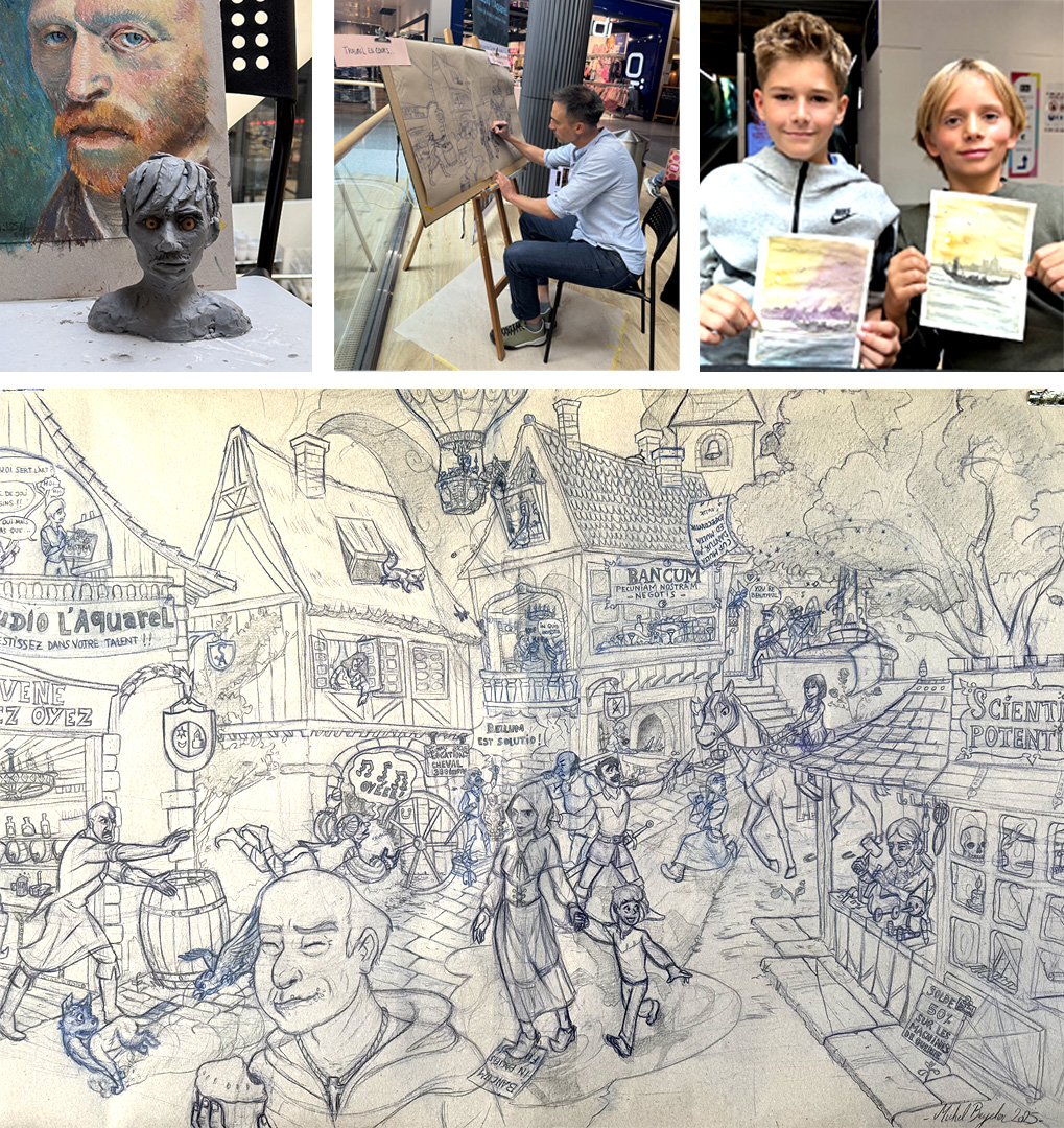 Les ateliers de BD-Manga et Aquarelle auront lieu le lundi, mardi, mercredi, jeudi et samedi de 9h45 à 12h et de 14h à 16h ainsi que de (18h à 19h)*sous réserve de "démonstration live" .
